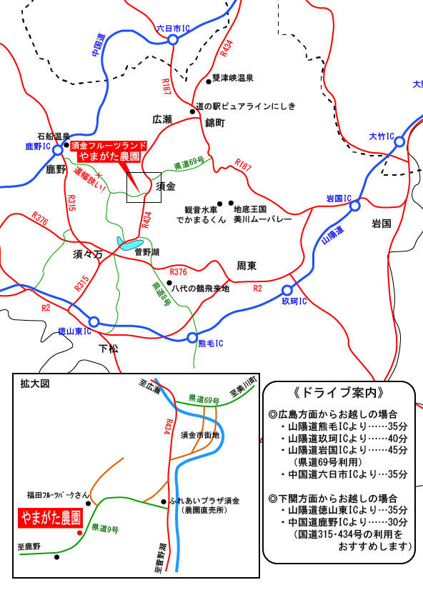 | 県道9号への入口にある、ふれあいプラザ須金(下の写真)が目印です。 ここを曲がればいよいよ農園です。 広く整備された道を進み、右手に福田フルーツさんが見えたら、あと200mほどで「やまがた農園」に到着です。 |